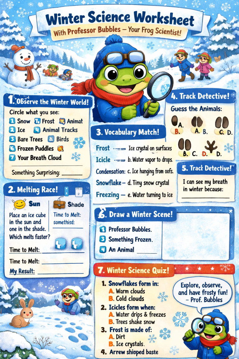 Get ready for a fun winter science adventure with Professor Bubbles, your friendly frog scientist!In this colorful, illustrated worksheet, children explore winter nature and science through observation, simple experiments, puzzles, and drawing activities. Kids will learn about snow, frost, ice,…